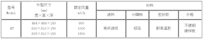 250℃耐高溫高效過濾器型號尺寸及其它參數(shù):