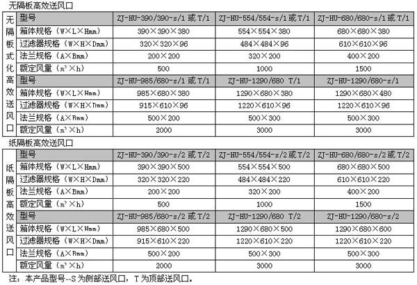 高效送風口常用規(guī)格尺寸及型號參數: