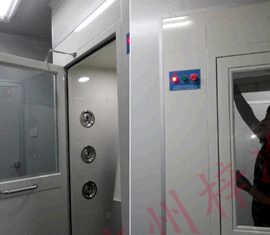 采取自動(dòng)感應(yīng)方式啟動(dòng)風(fēng)淋,定時(shí)器計(jì)時(shí)結(jié)束吹淋,(雙門采用電動(dòng)聯(lián)鎖);在內(nèi)部置緊急停止按鈕,按下急停按鈕,雙門均可打開;停電時(shí)雙門均可打開。