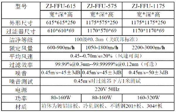 FFU凈化單元規格尺寸及型號參數: